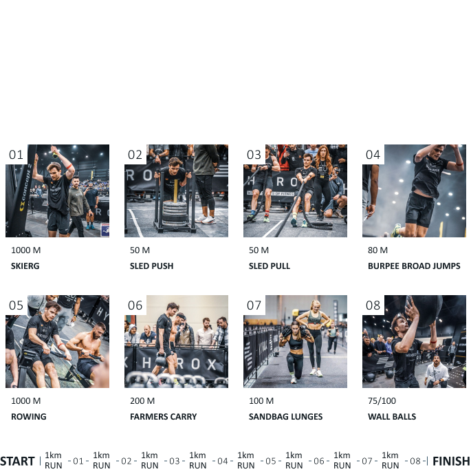 HYROX ist eine Kombination aus verschiedenen Lauf- und Functional-Workout Übungen, bei der die Teilnehmer 1 km laufen, gefolgt von einer Functional-Workout-Übung. Dies wird insgesamt acht Mal wiederholt.